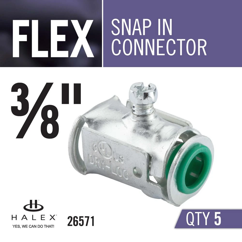 The 3/8 in. Snap-In Connectors (5-Pack) effectively bond and connect Mc, Ac and flexible metallic conduit to a steel outlet box or other metal enclosure. They install quickly and easily and require no additional hardware. This Snap-In Connector meets UL and CSA requirements.