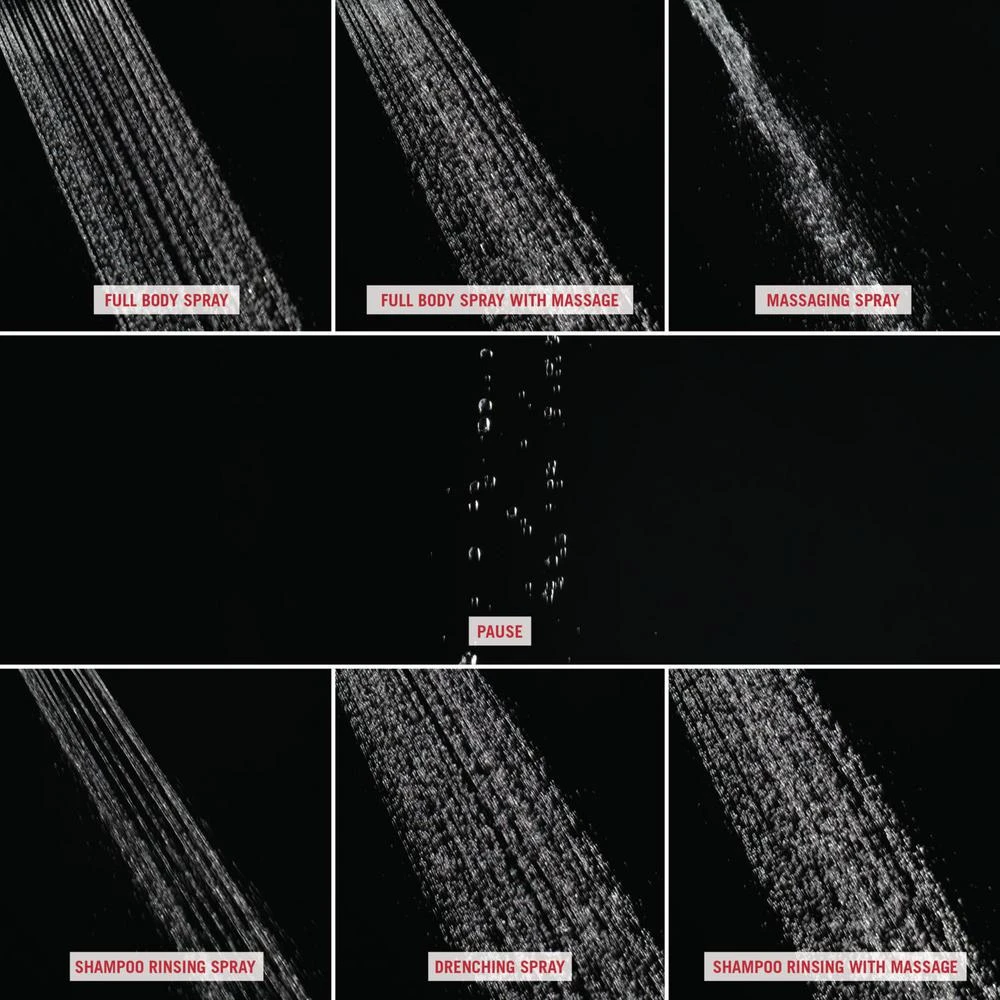 - Spray settings include: full body spray, full spray with massage, massaging spray, shampoo rinsing spray, shampoo rinsing spray with massage, drenching spray