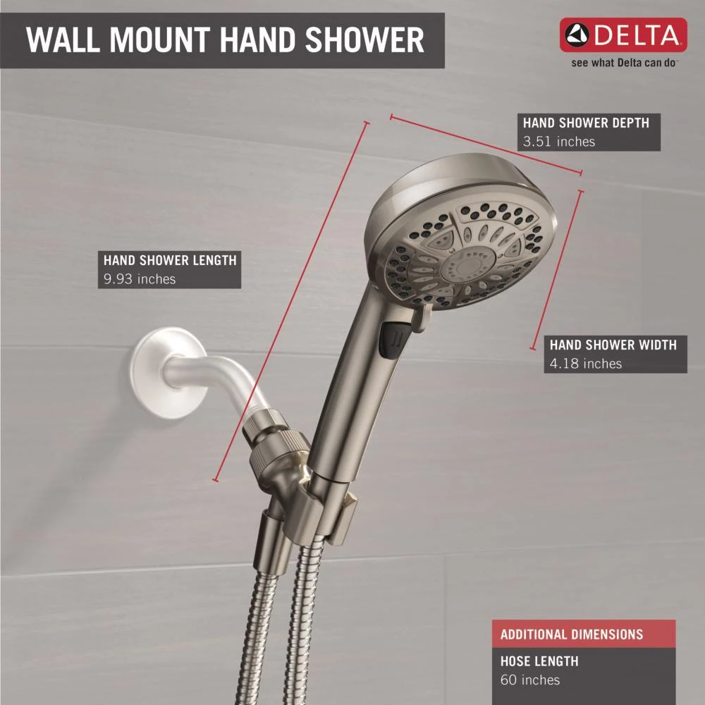 Experience a better shower with the control and flexibility of a Delta hand shower. Great for showering yourself or your loved ones and pets, as well as for keeping your shower and tub clean. Delta SpotShield Technology helps to keep your shower cleaner, longer by resisting water spots and fingerprints. Keep your space spotless with SpotShield Technology, available across a variety of finishes for the kitchen and bath. While other products may gather unsightly mineral build-up over time, Delta soft rubber Touch-Clean spray holes allow any mineral residue to simply be wiped away for an instantly refreshed look – with no need for soaking or the aid of chemical cleaners. The pause setting gives you ample space for shaving, lathering and other shower tasks, then easily restarts the water with the temperature where you left off. This spray setting helps you conserve water, so you can worry less about depleting your supply of hot water – and you help the environment too. Delta WaterSense labeled faucets, showers and toilets use at least 20% less water than the industry standard-saving you money without compromising performance.