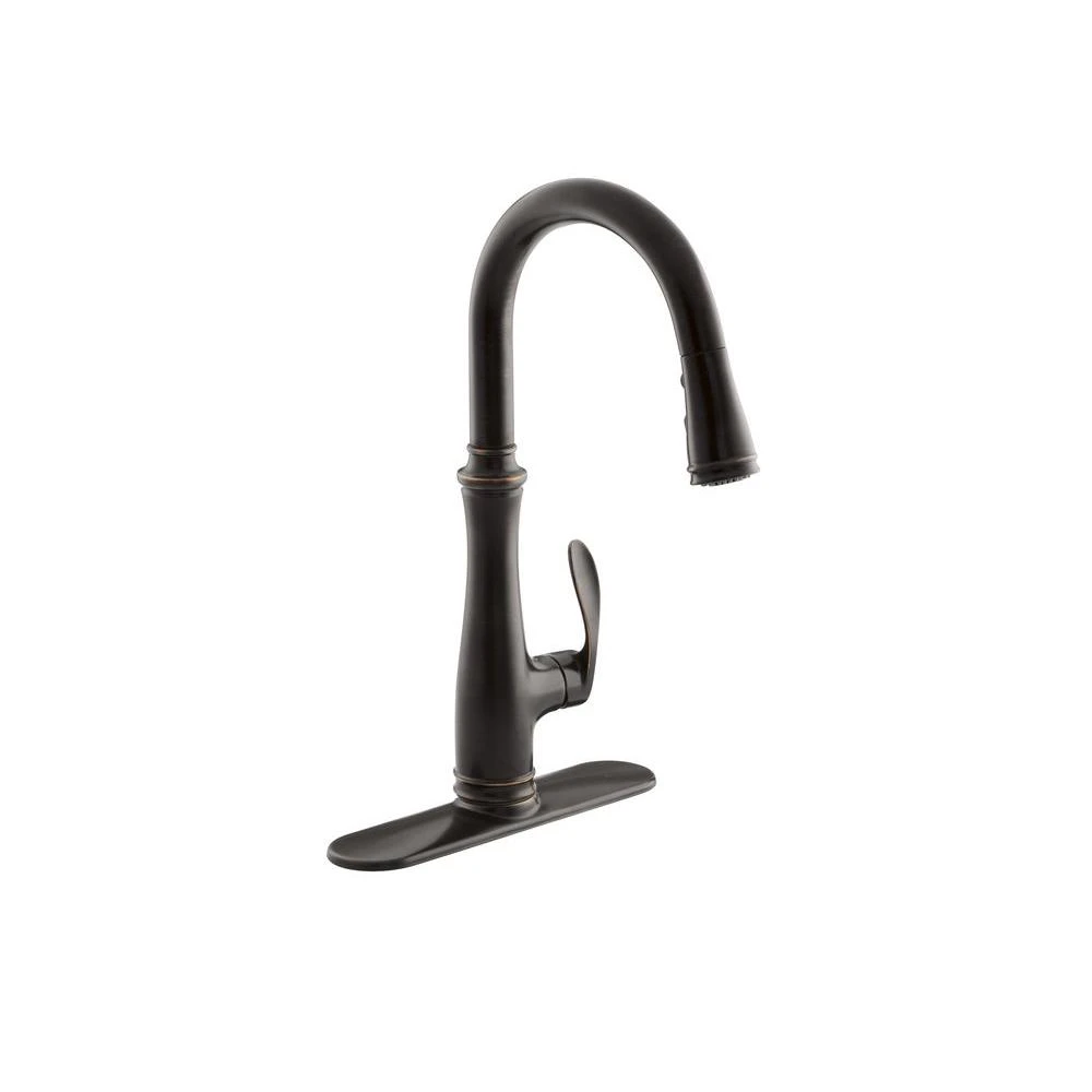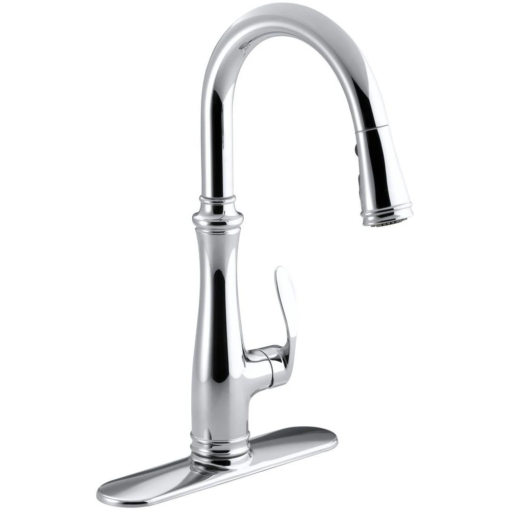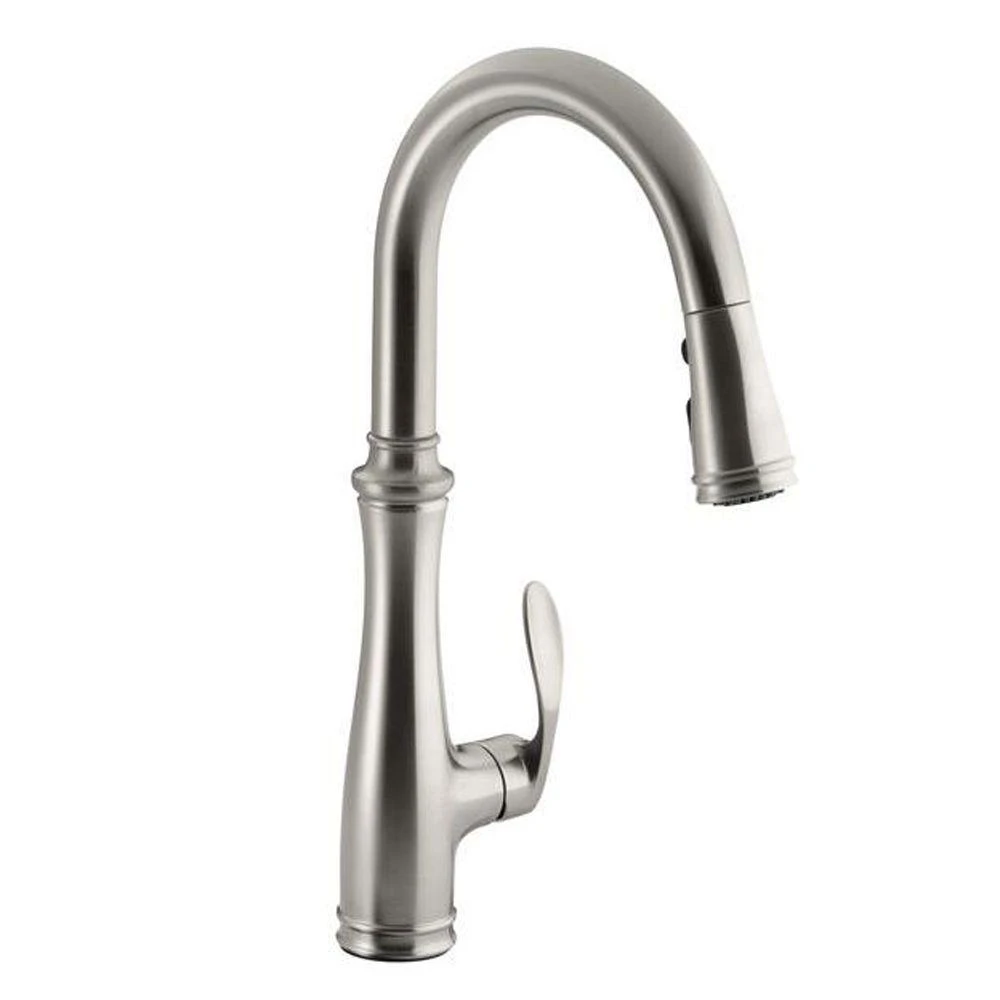 With its sleek look and innovative features, this Bellera pull-down kitchen faucet combines an elegant, versatile design with exceptional ergonomics and functionality. The high-arch spout rotates 360° degrees and reaches over the tallest pots, while the compact, three-function sprayhead pulls down into the sink for up-close tasks, or out of the sink to fill pots. Sweep spray creates a wide, forceful blade of water for superior cleaning. KOHLER’s new docking system, DockNetik, secures the pull-down sprayhead to the spout using magnetic force.