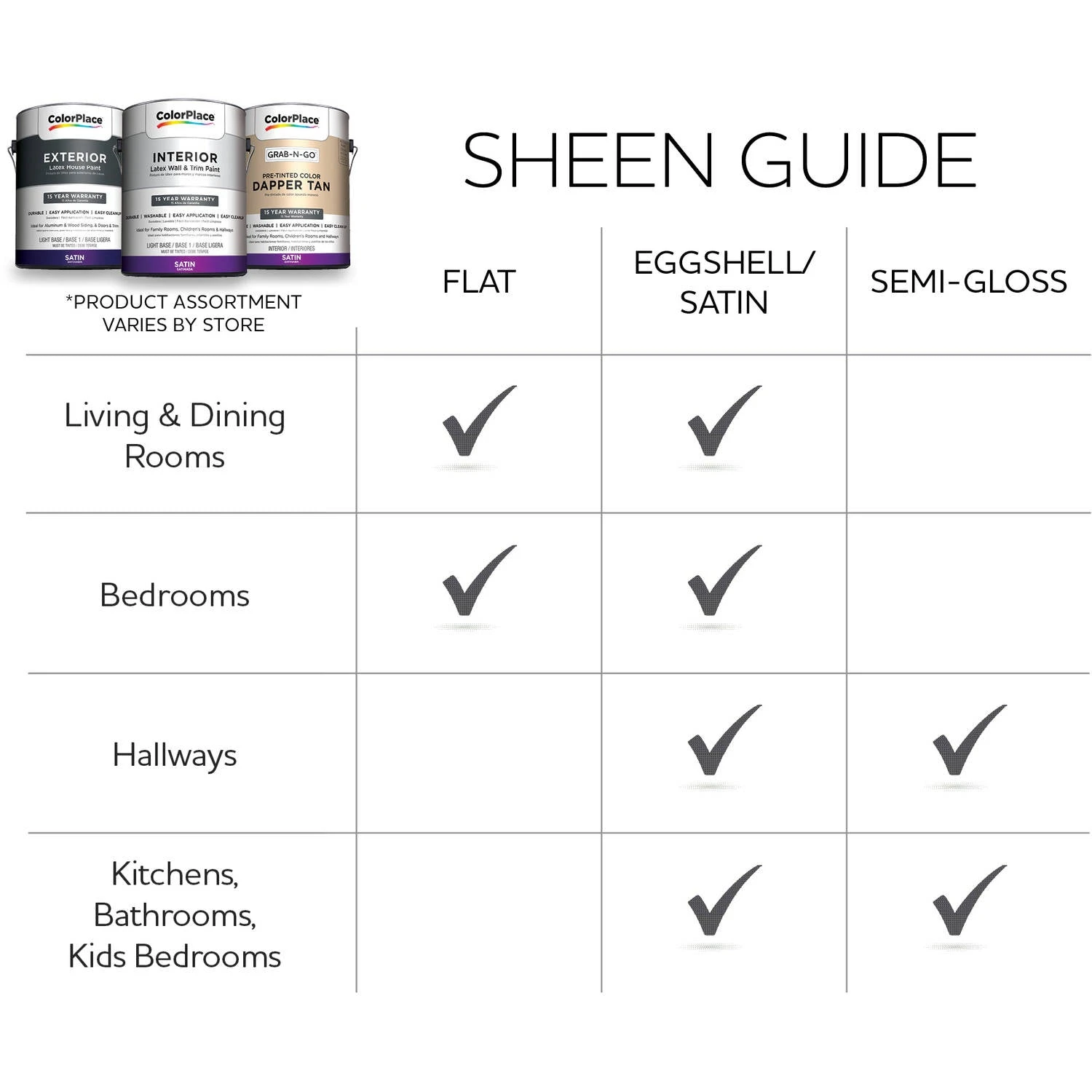 ColorPlace Pre Mixed Ready to Use Paints are ready-mixed (pre-tinted) paints, ready to go, available in a designer-inspired palette of top colors. These latex interior paints are a great value and a convenient option. Simply grab a can off the shelf and go with ColorPlacePre Mixed Ready to Use Paints. ColorPlace Pre Mixed Ready to Use Paint delivers a quick drying durable finish so you can get your space back to being enjoyed. ColorPlace Pre Mixed Ready to Use Paint provides easy application and easy clean up. Ideal for use on properly prepared interior walls, ceilings, or trim. Our suggestions for finish are as follows: a flat finish for living rooms and bedrooms; a satin finish for family rooms, kids rooms and hallways; and a semi-gloss finish for kitchens, bathrooms and hallways. You can always chose a finish that works best for what look and space requirements you have as all colors can be tinted in the sheen of your choosingColorPlace Pre Mixed Interior Paint: