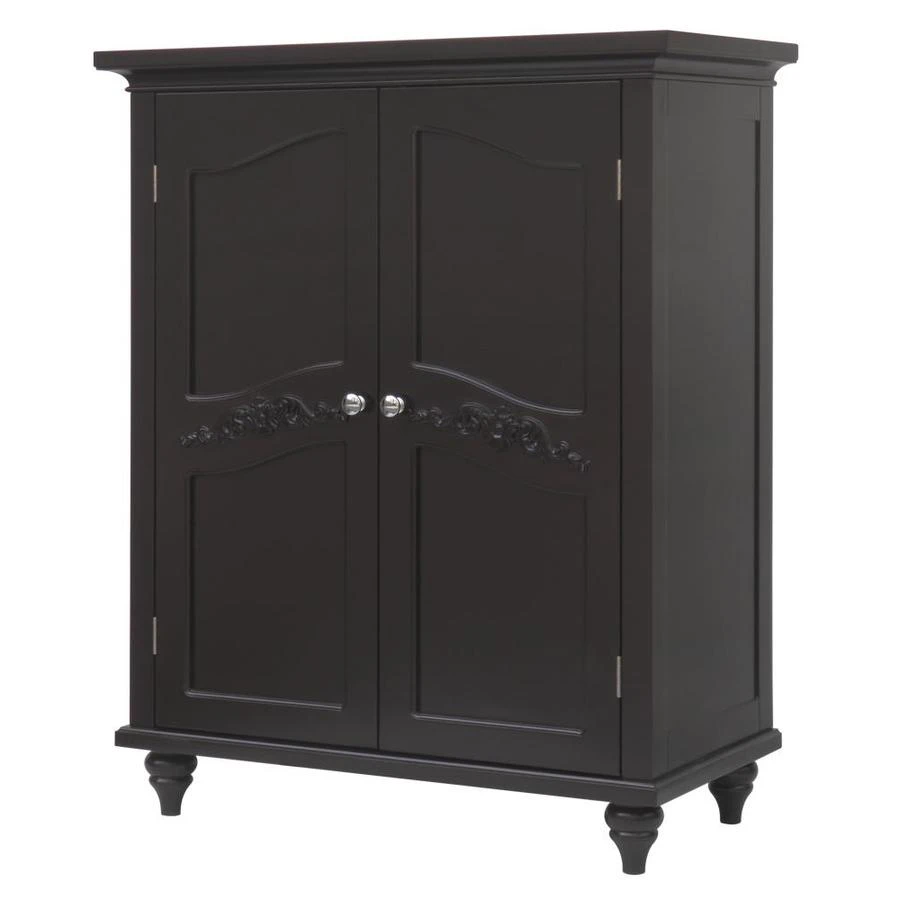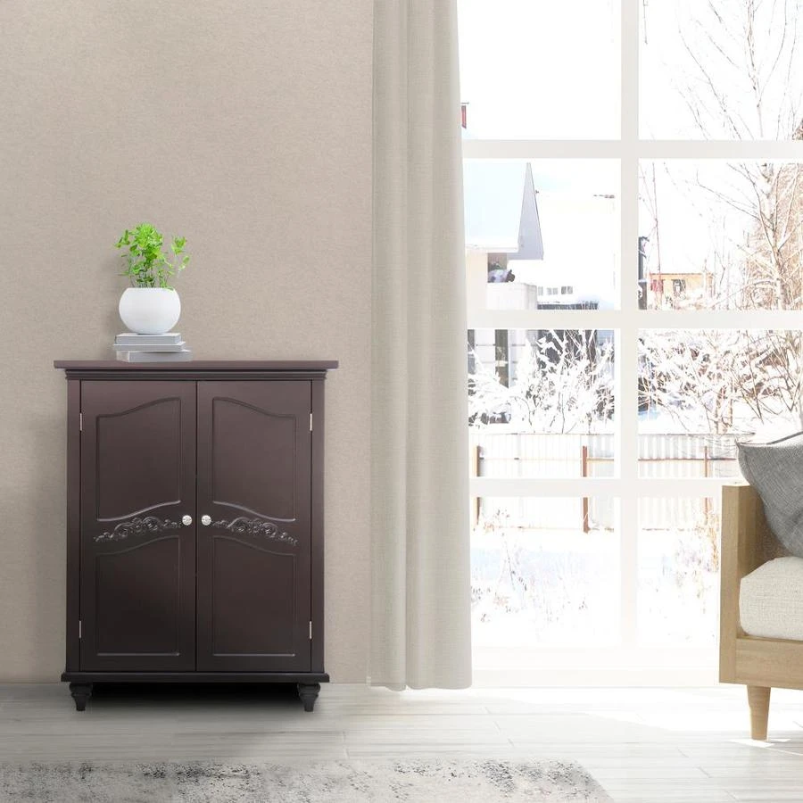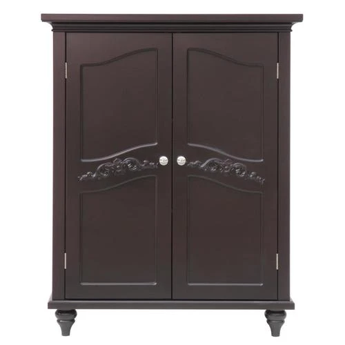 STYLISH FLOOR CABINET: Features a dark espresso finish with a crown molded top, metal knobs, and engraved doors for a timeless addition to your space