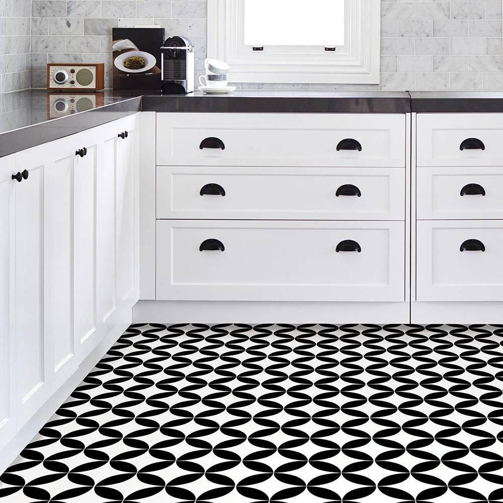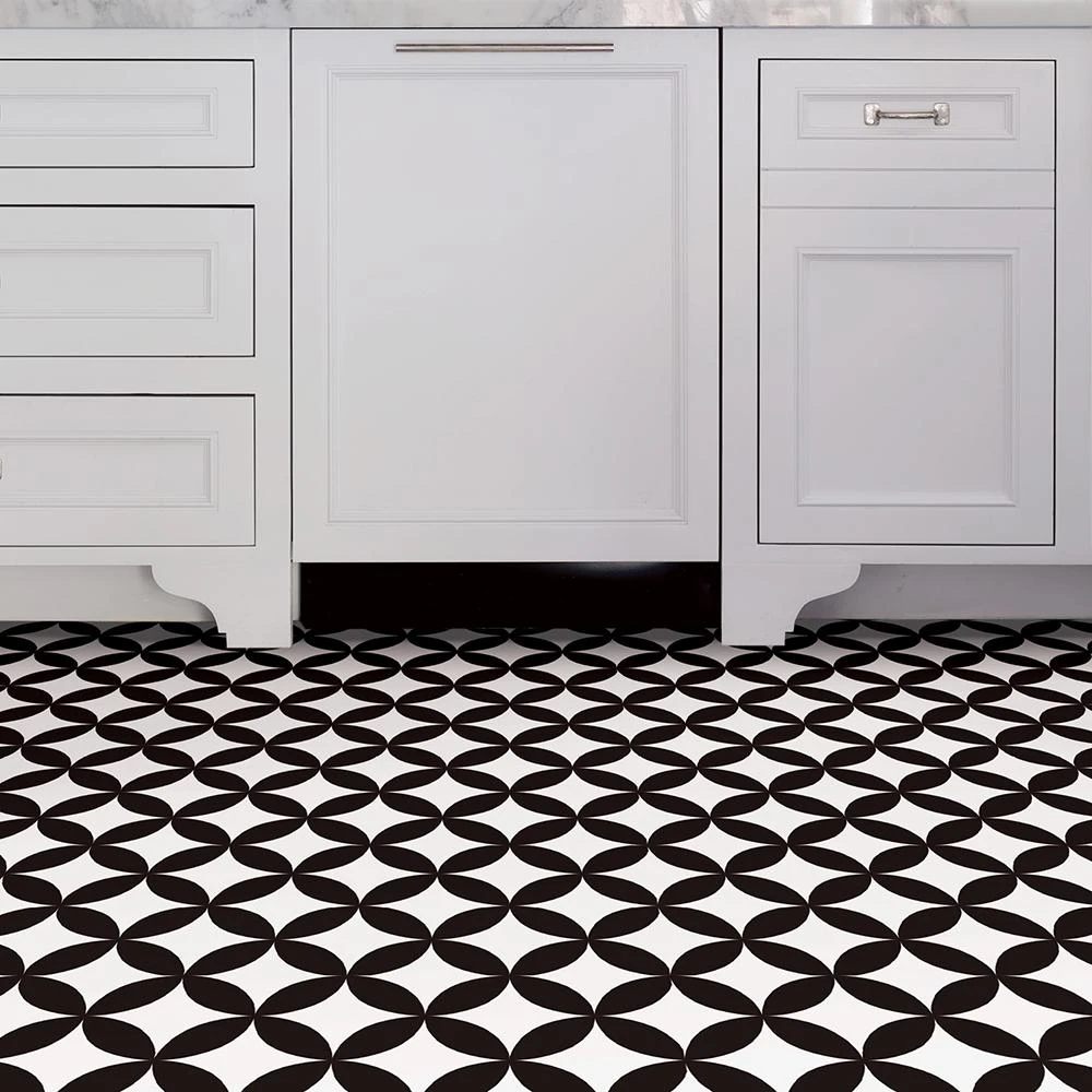 A retro inspired pattern with a classic black and white palette. A series of overlapping circles create a floral geometric design perfect for both kitchens and bathrooms. Starlight Peel and Stick Floor Tiles contains 20 pieces on 20 sheets that each measure 12 in. x 12 in.
