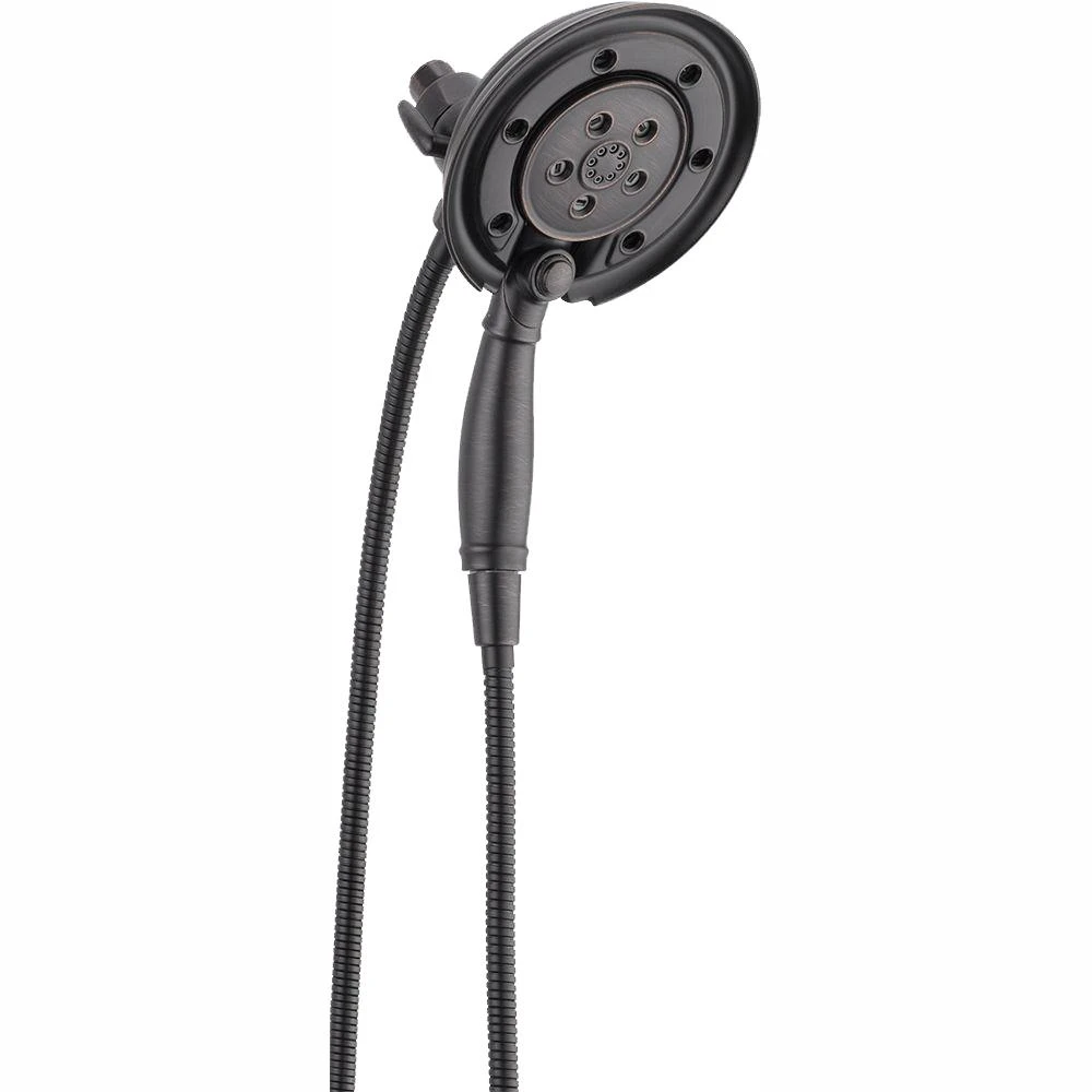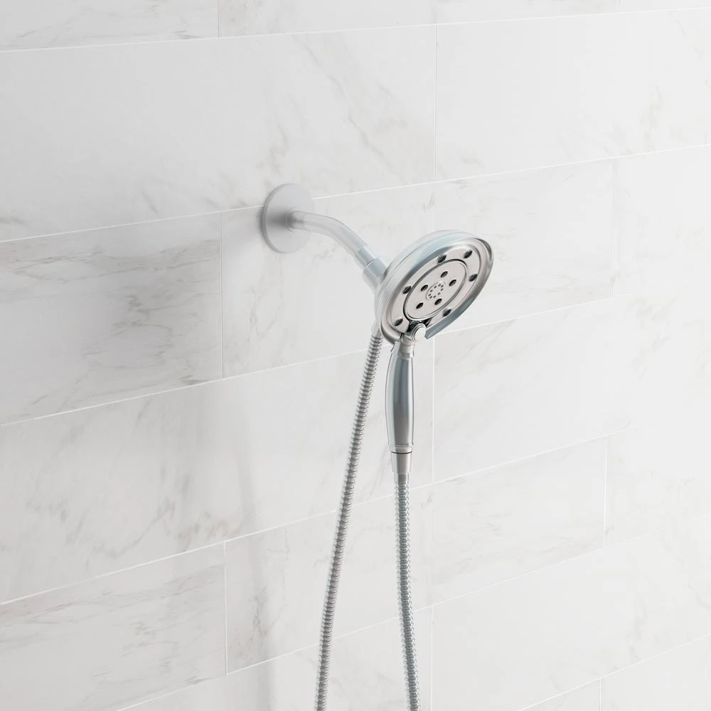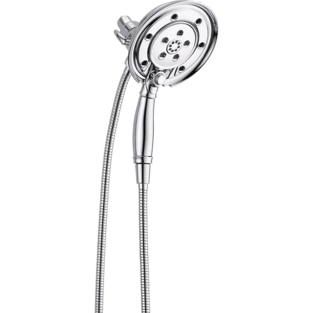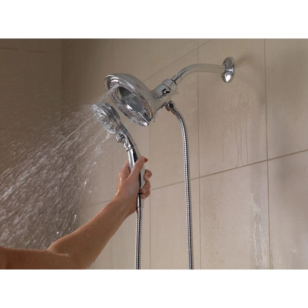 Wash the day away with this In2ition 2-In-1 4-Spray Hand shower and Showerhead Combo Kit in Chrome Featuring H2Okinetic and MagnaTite Docking. Use the integrated showerheads together or separately to get water where you need it most. With 4 different settings, including a pause feature, this hand shower has you covered from top to bottom, or bottom to top. Use the innovative pause function to reduce the water to a trickle, allowing you to conserve water while doing such tasks as lathering up or shaving your legs. Buy with confidence, knowing that Delta backs all of its products with a lifetime limited warranty.