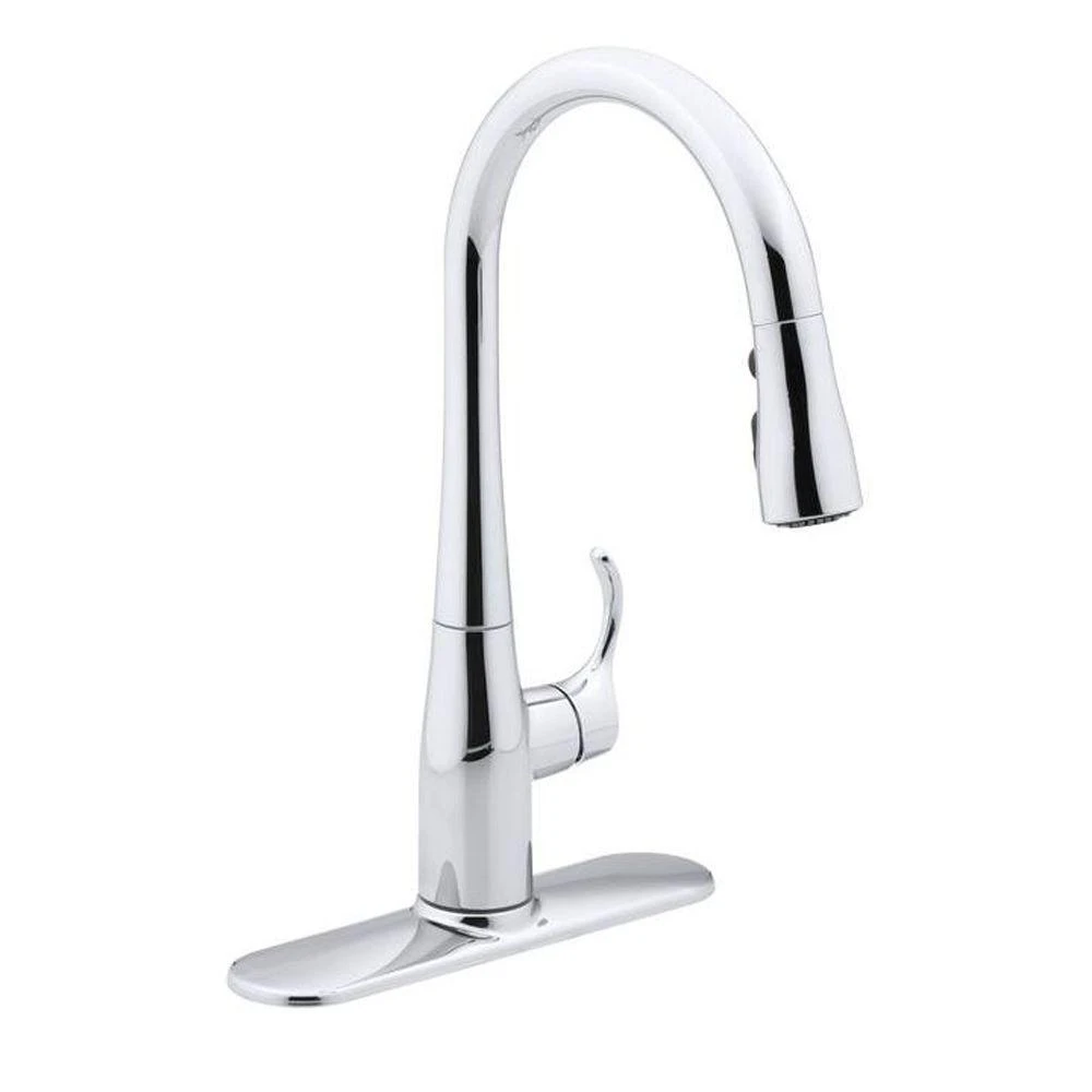 An innovative fit for a variety of kitchens and tasks, this Simplice bar or prep sink pull down kitchen faucet combines an elegant, universal design with exceptional ergonomics and functionality. The high-arc swing spout rotates 360°, while the smoothly maneuvering spray head pulls down into the sink for up-close tasks, or out of the sink to fill pots. Sculpted buttons on the spray head ensure simple operation even with wet, soapy hands.