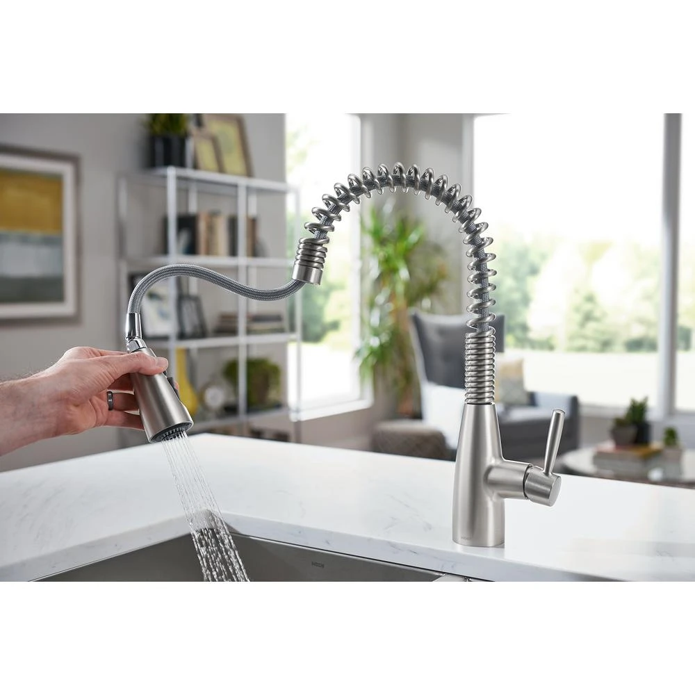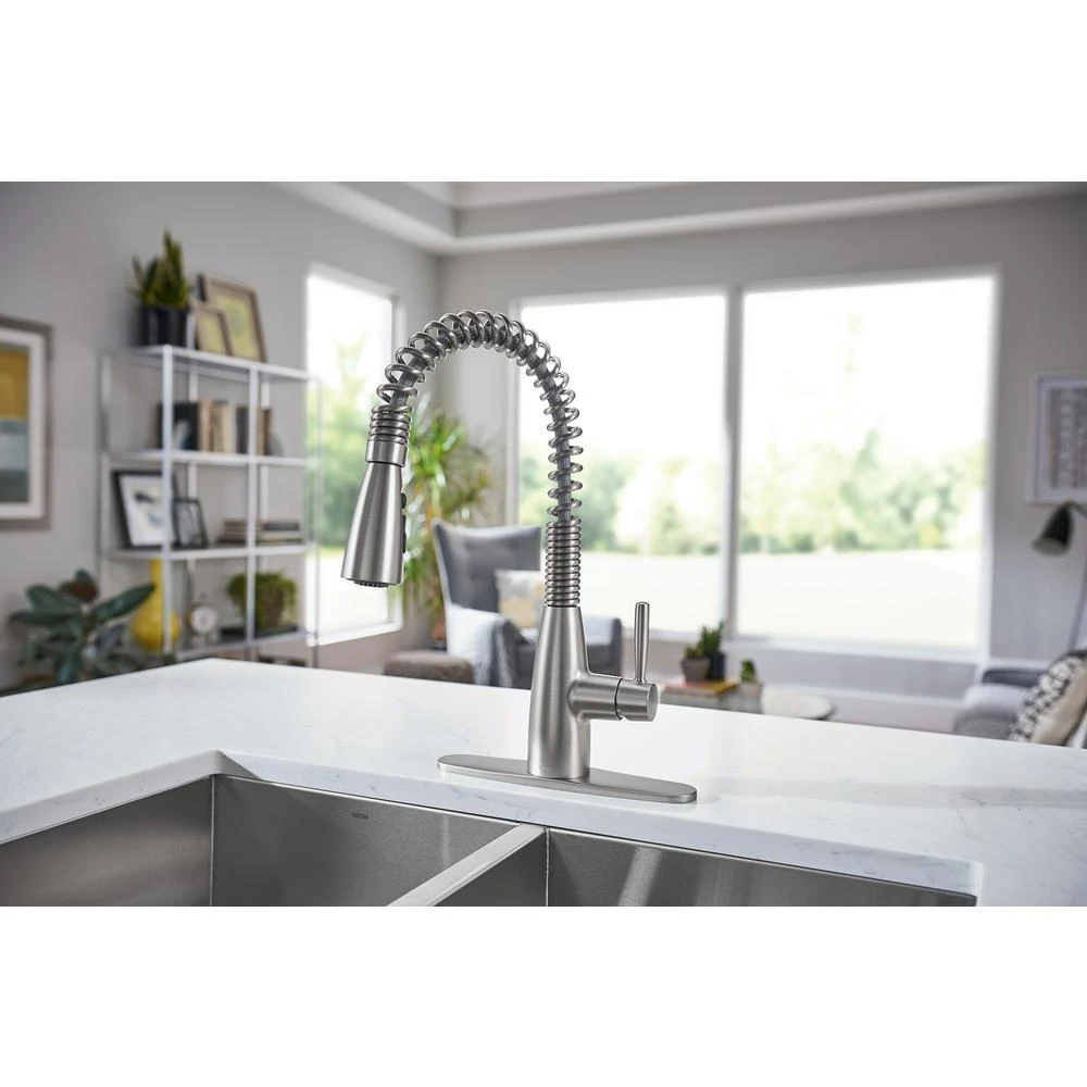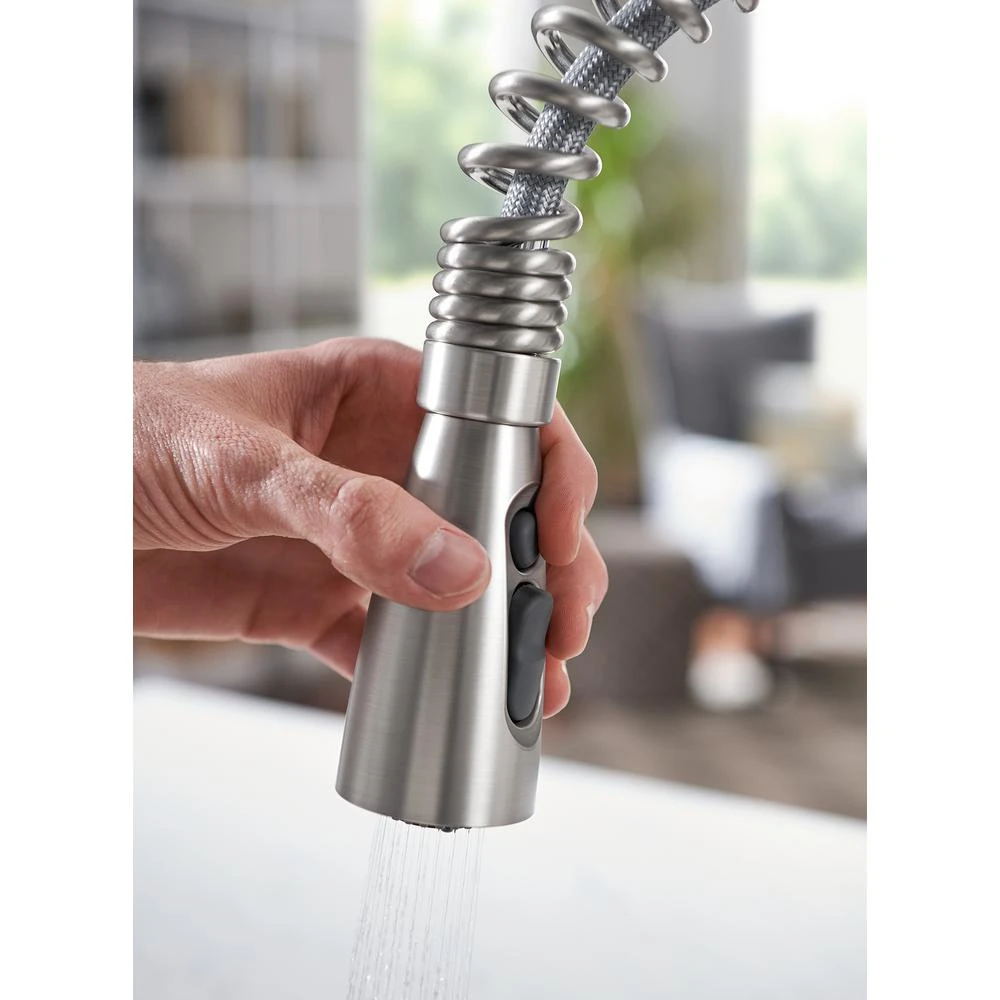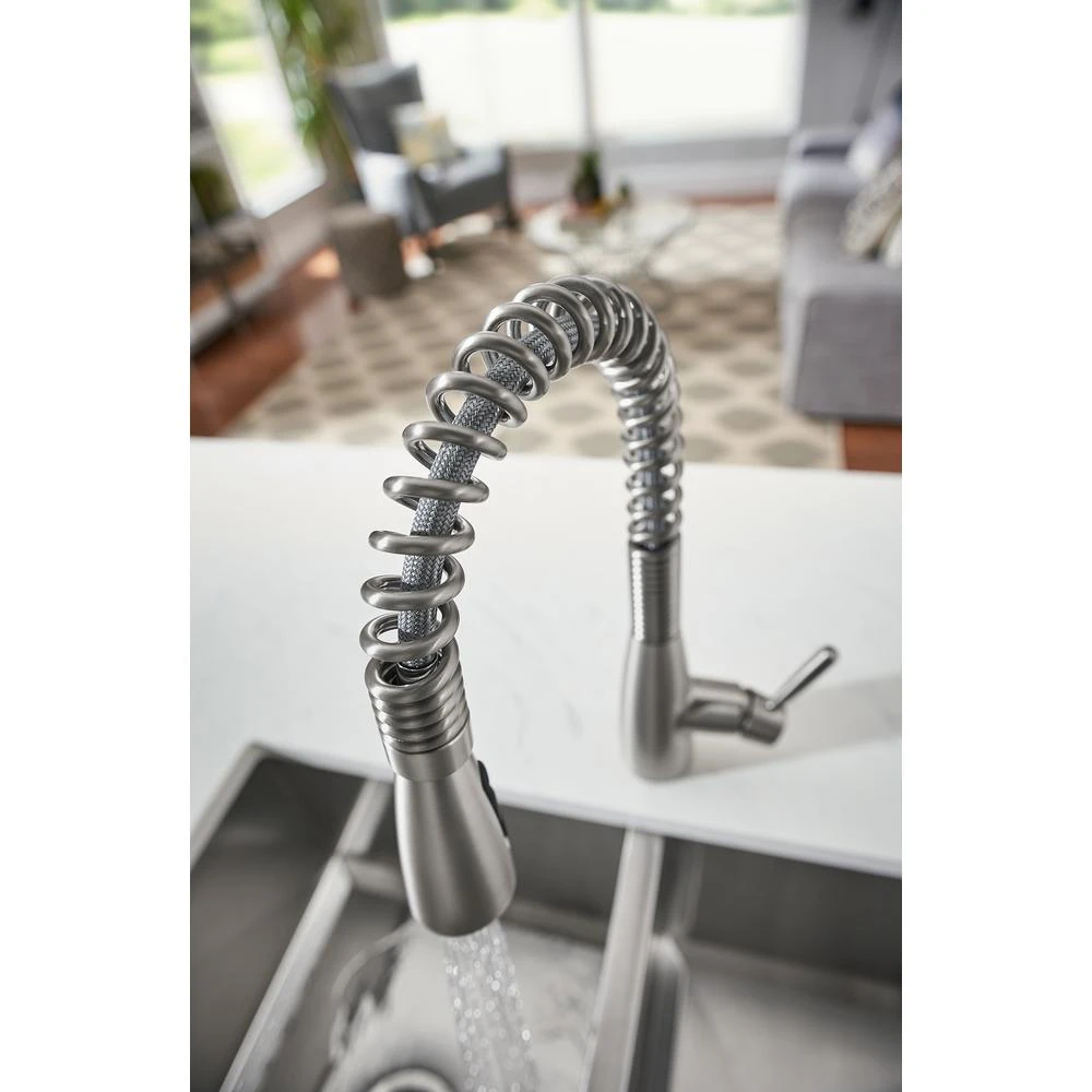 A perfect addition to your kitchen, this Single-Handle Pull-Down Sprayer from the Springvale collection features a spot resistant stainless steel finish that helps keep your kitchen looking cleaner by resisting fingerprints and water spots. Each faucet includes power boost technology that easily produces 50% more spray power than other faucets. The self-retracting hose system offers smooth operation and docking while the Duralock quick connect system makes for a quick and easy installation.