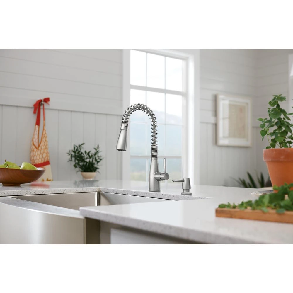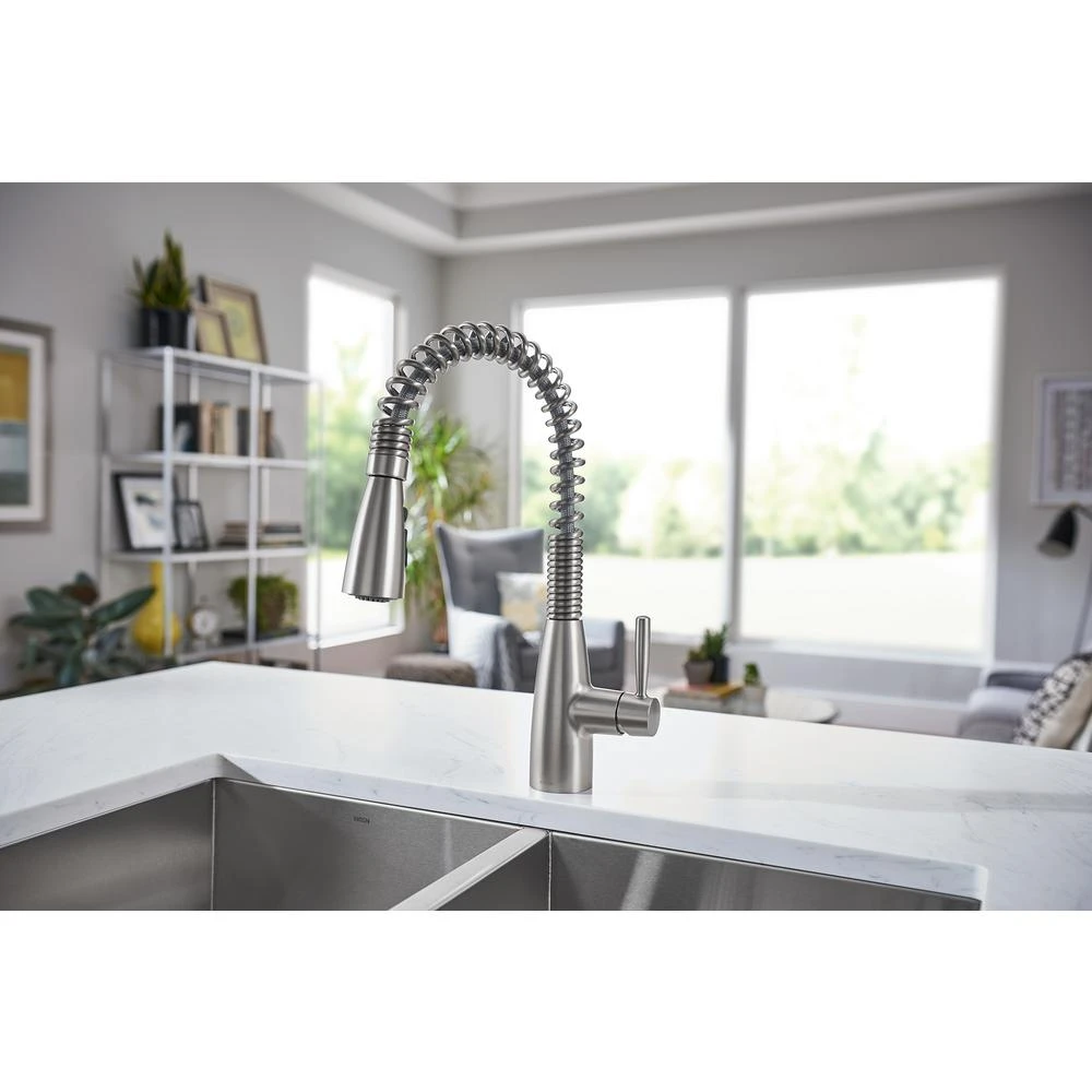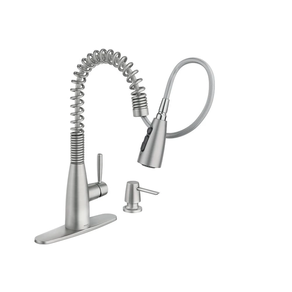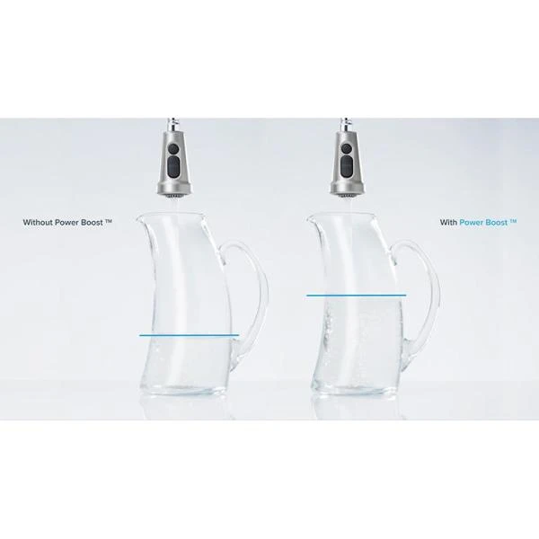 A perfect addition to your kitchen, this Single-Handle Pull-Down Sprayer from the Springvale collection features a spot resistant stainless steel finish that helps keep your kitchen looking cleaner by resisting fingerprints and water spots. Each faucet includes power boost technology that easily produces 50% more spray power than other faucets. The self-retracting hose system offers smooth operation and docking while the Duralock quick connect system makes for a quick and easy installation.