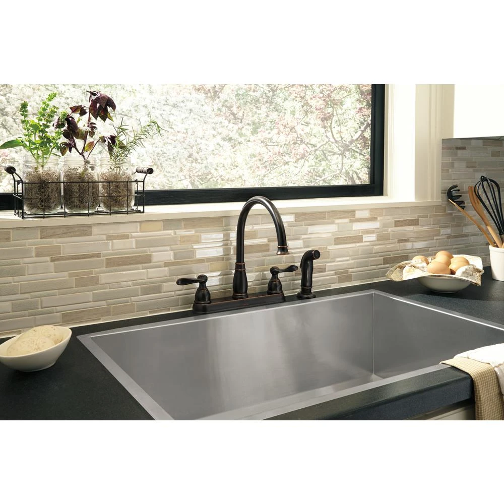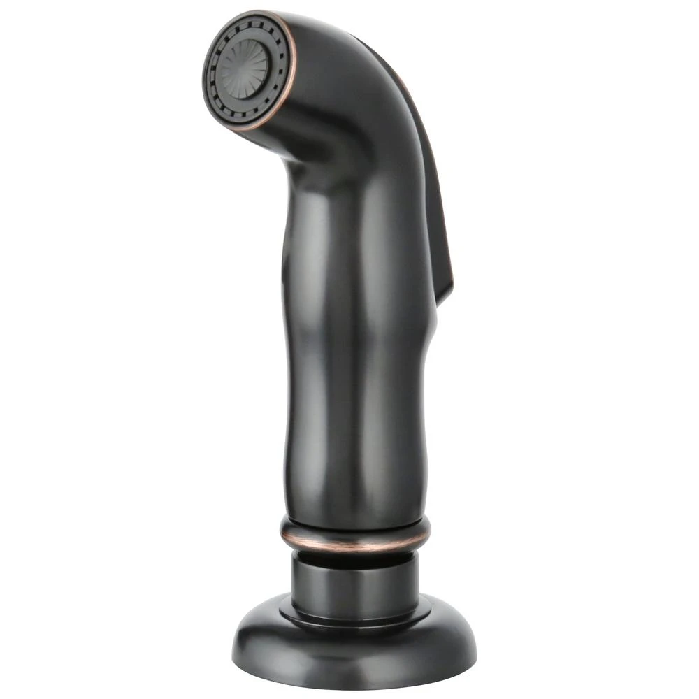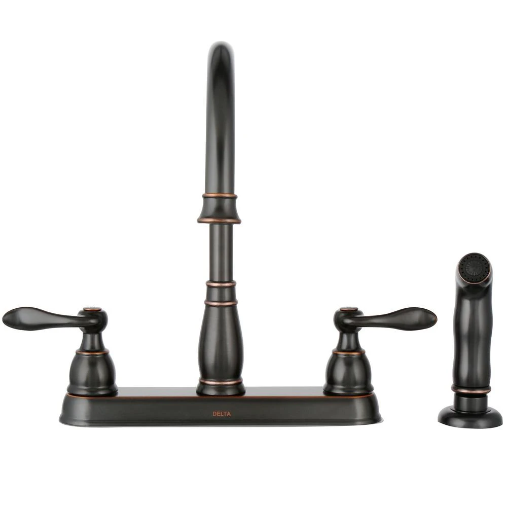 The Delta Windemere 2-Handle Side Sprayer Kitchen Faucet in Oil-Rubbed Bronze features good clearance for a large work area with a high-arc spout and includes a matching sprayer to help complete the look or your faucet and make cleanup easy. The faucet’s metal construction helps ensure long-lasting use for your added convenience.